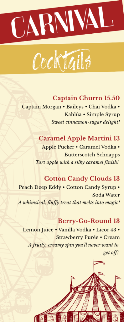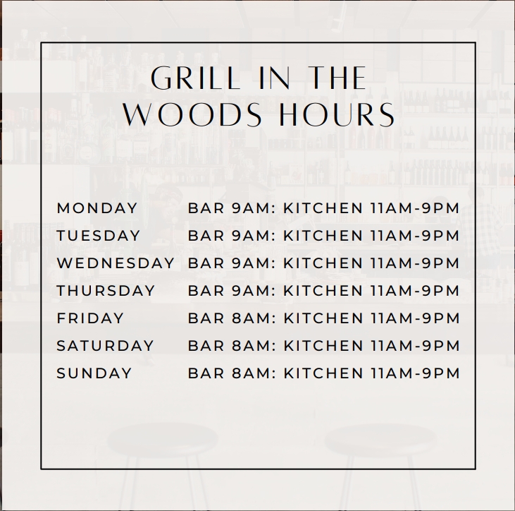 Please join us at our restaurant, Grill In The Woods. Relax in the dining room while enjoying stunning views of the golf course, 30 beers on tap, our new signature cocktails, and a great selection of wines by the glass. The menu features a mix of signature dishes and elevated classics, with a focus on premium ingredients and creative flavor combinations. Click here – View Dining Menu | Click Here – View Kids Menu